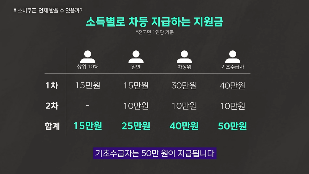 이 부분에 대해서도 14F 일사에프 채널이 이미지로 깔끔하게 잘 정리해 두었다. 기본적으로 연봉 약 7,700만 원이 넘는 상위 10% 소득자들은 15만 원이 지급되고, 일반인은 25만 원, 차상위 계층은 40만 원, 기초 수급자는 50만 원으로 차등 지급이 된다고 한다. 지금 글을 쓰는 나는 차상위 계층이다 보니 40만 원 정도 받게 될 것 같았다.