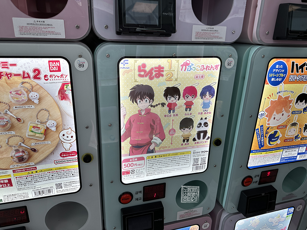매장 내부에서 볼 수 있는 여러 가챠 기기를 보면 여성 오타쿠 소비자들이 좋아하는 <주술회전>이라는 작품의 가챠 기기부터 시작해서 우리에게 추억의 작품으로 통하는 <란마 1/2> 가챠 기기도 있었다. <란마 1/2>는 애니메이션이 리메이크되어 한 차례 방영되기도 했다 보니 처음 작품을 접한 사람들도 적지 않을 것이다.