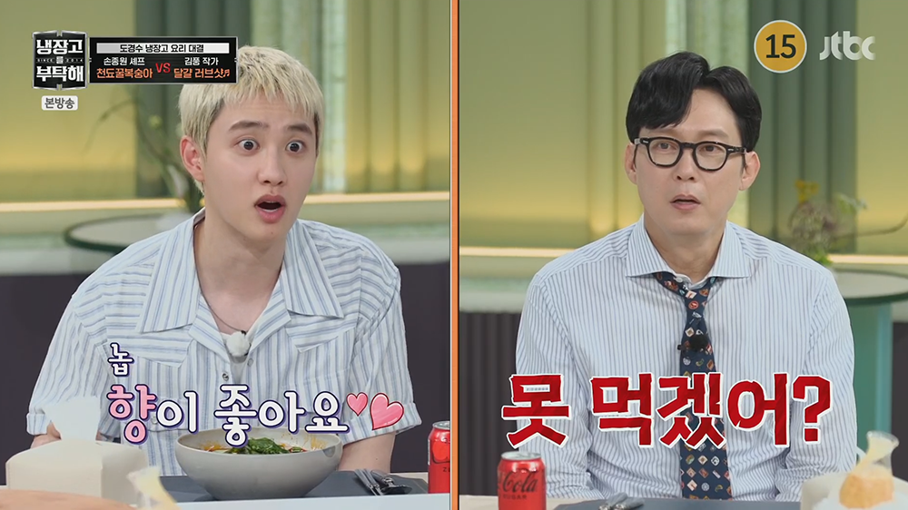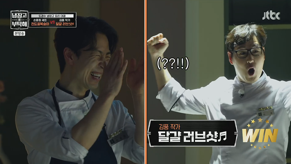 그렇다. 최종적으로 도경수의 선택을 받은 것은 김풍 작가의 '달걀 러브샷♬'이었다. 그가 이 선택을 한 이유는 두 요리를 순서대로 먹었을 때 김풍 작가의 요리가 가진 향과 맛이 너무 강해 손종원 셰프의 요리를 먹었을 때 맛이 미묘하게 느껴졌다고 한다. 그리고 요리 대결의 주제인 한 번도 맛본 적 없는 차가운 요리는 김풍 작가의 요리였다.