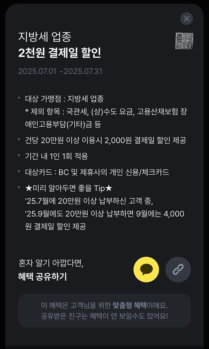 이건 7월에만 한번 있는 게 아니라 9월까지 적용이 되는 것으로 보였는데, 마이태그 할인 내용을 보면 '25. 7월에 20만 원 이상 납부하신 고객 중 25. 9월에도 20만 원 이상 납부하면 9월에는 4천 원 결제일 할인 제공'이 된다고 한다. 상반기를 다 보낸 이후 하반기를 맞아 다시 지방세를 결제해야 하는 사람들에게 유용한 혜택이다.