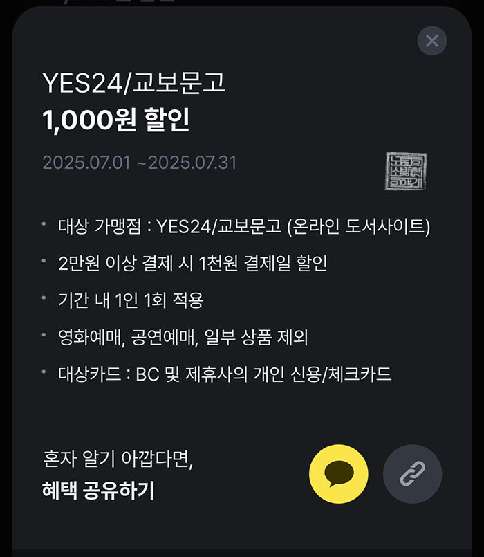 알라딘도 적용된다면 책을 좋아하는 사람들이 좀 더 많이 혜택을 받을 수 있겠지만, 아쉽게도 BC카드 페이북 마이태그 할인 혜택이 적용되는 곳은 예스24와 교보문고 두 사이트뿐이다. 두 사이트에서 2만 원 이상 결제 시 1천 원 결제일 할인을 받을 수 있는데… 영화와 공연 예매, 일부 상품은 제외되니 미리 참고할 수 있도록 하자.