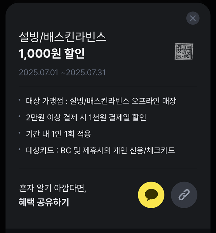 BC카드 유저라면 페이북 마이태그 할인을 통해서 오프라인 매장에서 2만 원 이상 결제할 경우 결제일 1천 원 할인을 받을 수 있으니 참고하자. 우리가 주의해야 할 점은 배달이 아니라 오프라인 매장에서 직접 2만 원 이상 결제해야 한다는 점이다. 배스킨라빈스는 좀 어려워도 설빙에서 2인 이상 방문하면 2만 원은 껌이다.