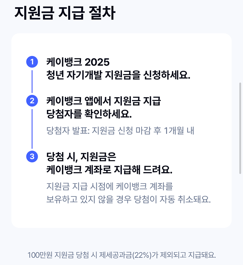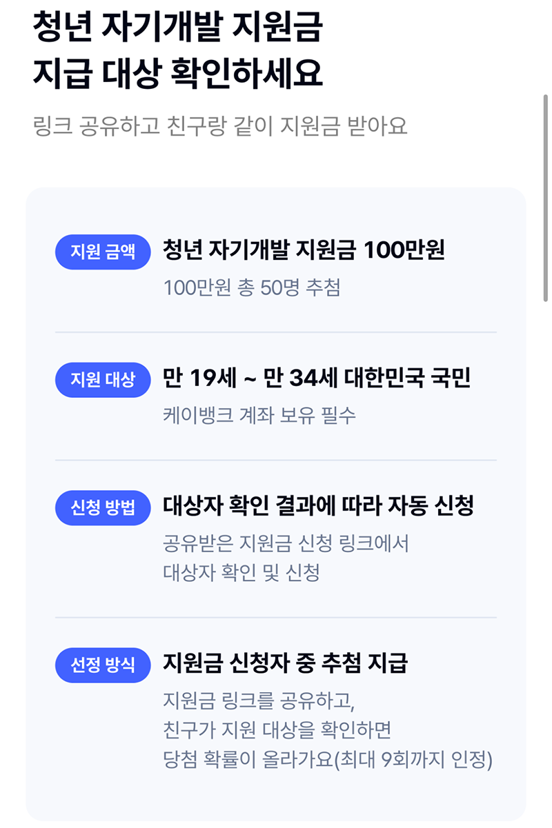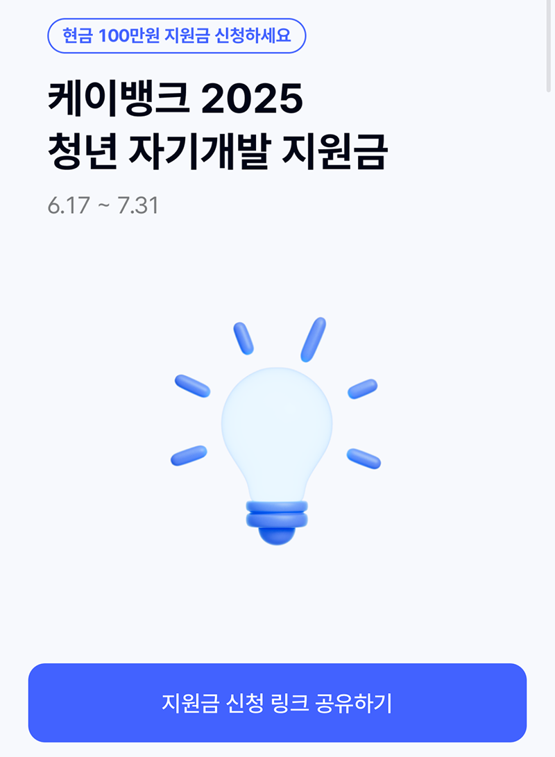 얼마 전에 스레드를 통해 알게 된 케이뱅크 청년 자기개발 지원금 100만 원도 대표적인 이벤트 중 하나다.