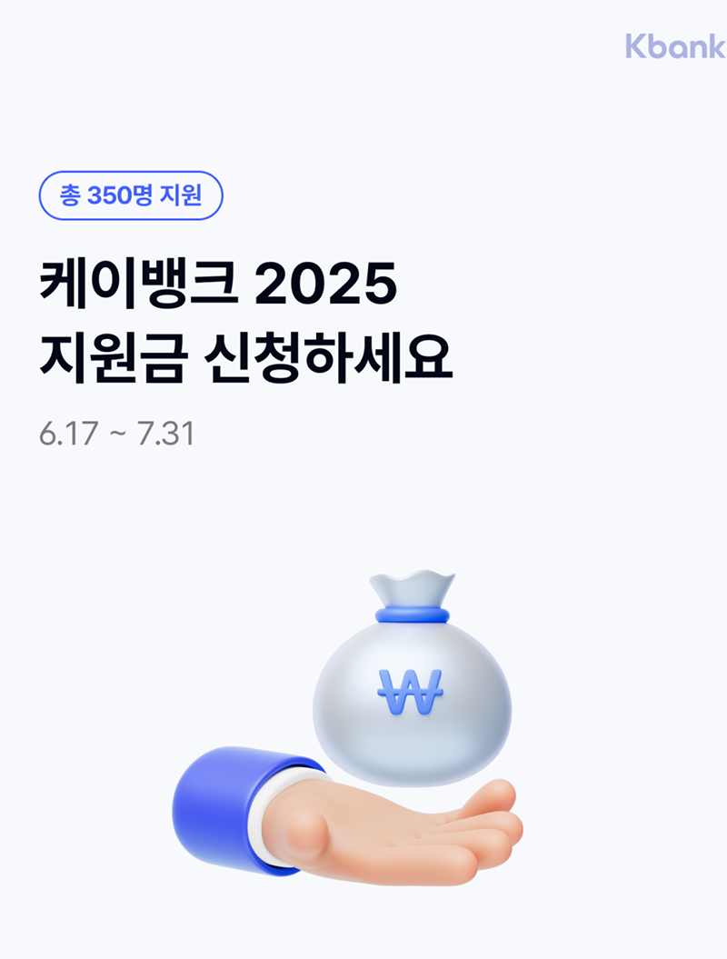 케이뱅크 지원금은 여름생활가전 지원금(150명 추첨), 슬기로운 여름 방학 생활 지원금(100명 추첨 1인당 5만 원), 청년 자기개발 지원금(50명 추첨), 우리 가족 행복 지원금(50명 추첨) 등이 있다. 네 가지 지원금을 받기 위한 이벤트에 참여하는 방식을 같아도 받을 수 있는 지원금의 규모가 조금씩 차이가 나서 확인이 필요하다.
