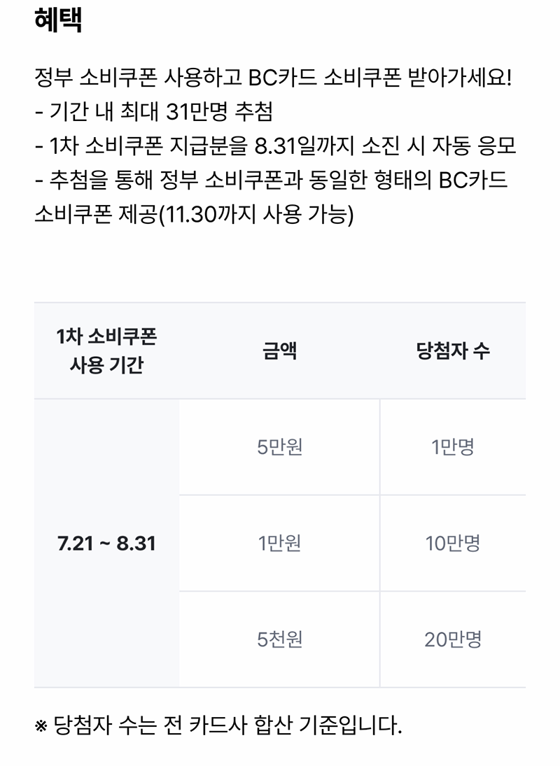 하지만 BC카드로 연동된 기업은행 카드를 이용할 경우에는 IBK 카드 어플이 아니라 페이북 어플을 통해 신청하는 것을 나는 추천하고 싶다. 왜냐하면, 정부 소비쿠폰을 사용하고 BC카드 소비쿠폰을 추가로 지급받을 수 있는 기회가 있기 때문이다. BC카드에서 추가로 지급하는 소비쿠폰의 금액과 받을 수 있는 인원수는 다음과 같았다.