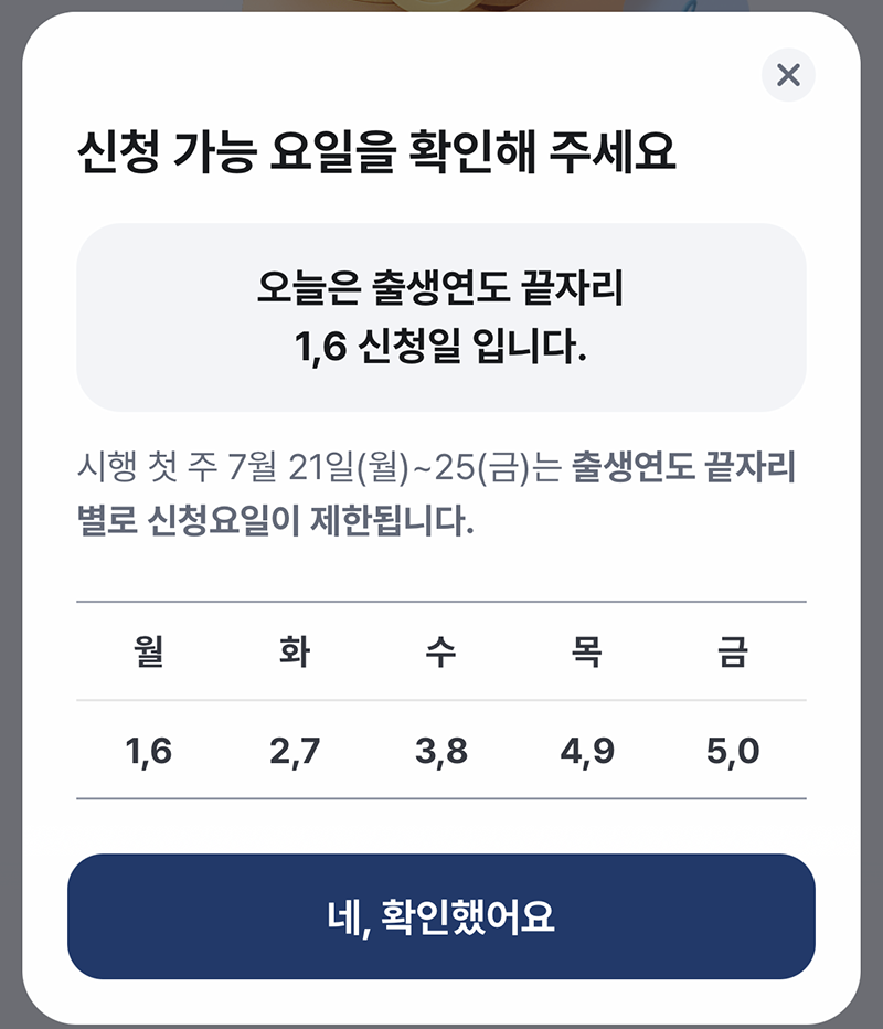 1차 민생회복 소비쿠폰 신청은 오늘 7월 21일(월)부터 시작할 수 있어도 '출생연도 끝자리'를 기준점으로 순차적으로 진행할 수 있다 보니 사용할 수 있는 시작 지점이 다르다. 나는 처음에 생년월일 끝자리인 줄 알고 오늘 신청이 가능한 것으로 알고 있었는데, 알고 보니 출생연도라 금요일에 1차 지원금을 신청할 수가 있었다.