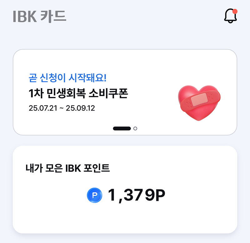 나차럼 IBK 기업은행 BC카드를 사용하는 사람들은 카드로 1차 민생회복 소비쿠폰를 받고자 할 경우 두 가지 선택지가 있었다. 하나는 IBK 카드 어플에서 신청하는 것이고, 하나는 BC카드 페이북 어플에서 신청하는 것이다. 기업은행 계좌와 연동된 체크카드 혹은 신용 카드 같은 경우에는 IBK 카드 어플을 이용하는 게 가장 편리하다.