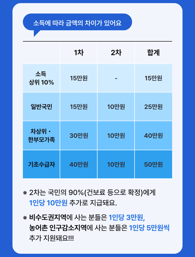 오늘 2025년 7월 21(월)부터 1차 민생회복 소비쿠폰 신청이 시작되었다. 전 국민이 받을 수 있는 이번 1차 민생회복 소비쿠폰은 소득 상위 10%와 일반 국민을 대상으로 1차 15만 원을 지급한 이후 2차 때는 상위 10%를 제외한 일반 국민을 대상으로 10만 원의 소비쿠폰이 지급되면서 약 25만 원의 민생회복지원금을 받을 수 있다.
