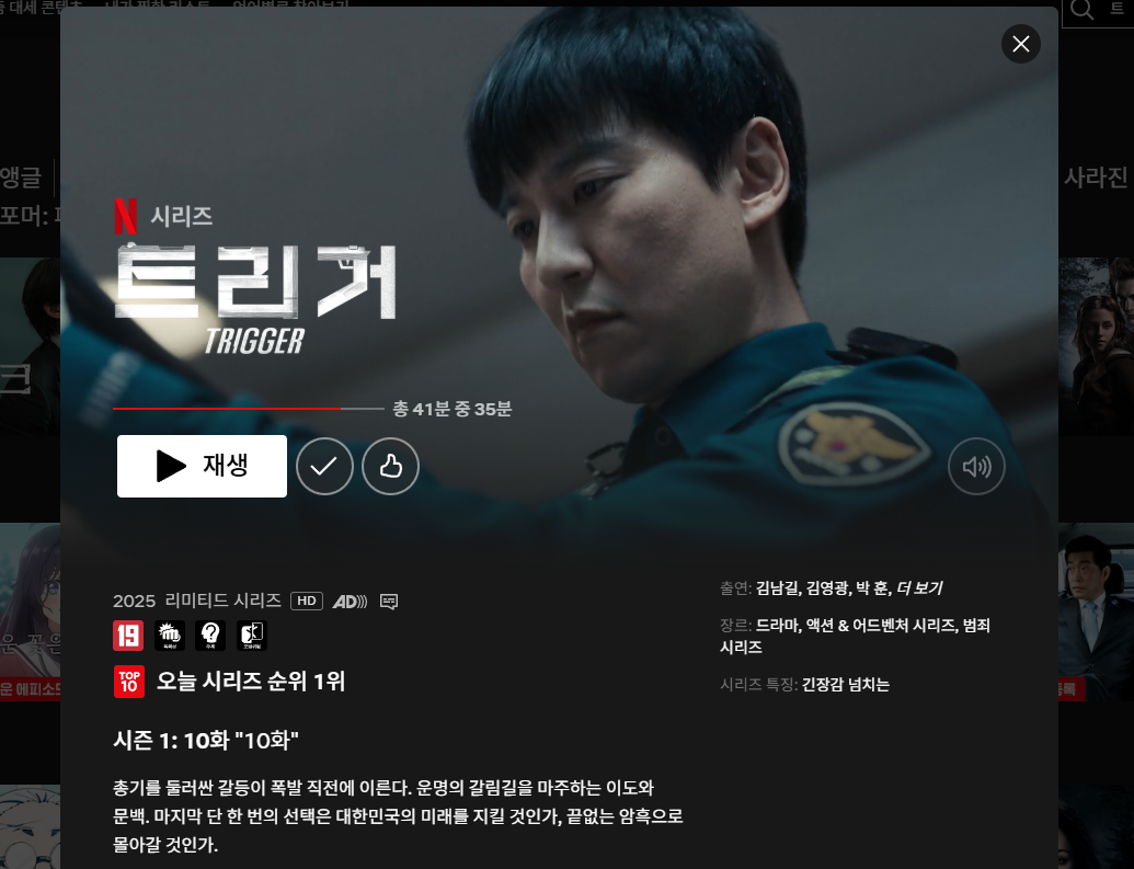 지난 금요일(25일)을 맞아 개인적으로 크게 기대하고 있던 넷플릭스 드라마 <트리거>가 정식 공개되었다. 일이 바빠서 토요일까지는 <트리거>를 보지 못하다가 오늘 일요일을 맞아 점심을 먹으면서 <트리거>를 틀기 시작했다가 10회를 꼬박 정주행 하고 말았는데, 이건 뭐라고 말할 수 없을 정도로 드라마를 재미있게 볼 수 있었다.
