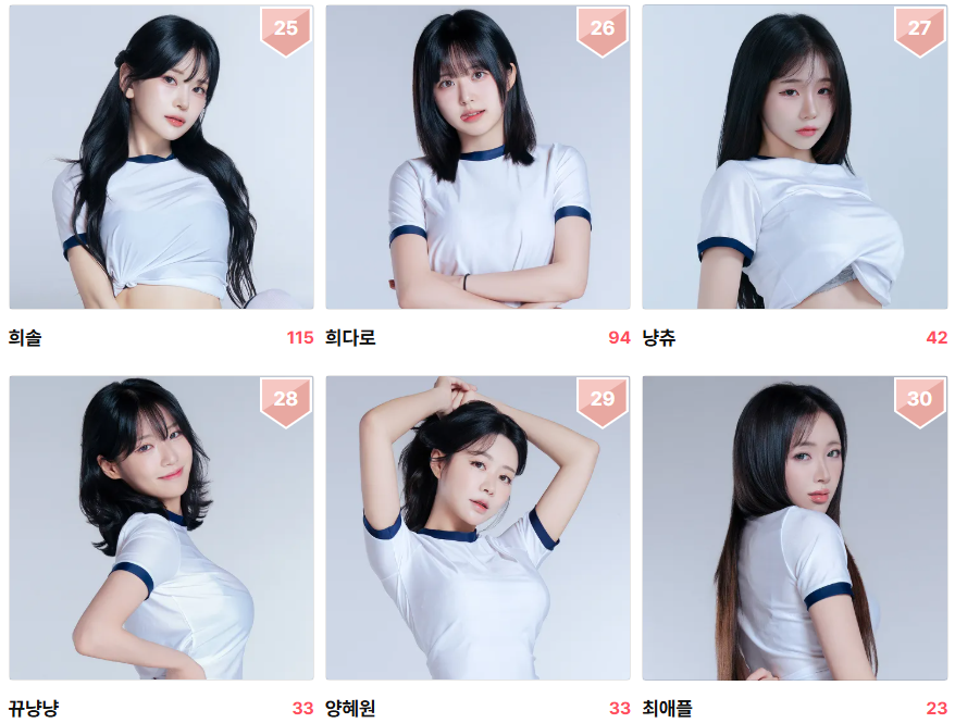 실시간 환승모델 개인투표 부문 인플루언서 상위권 현황