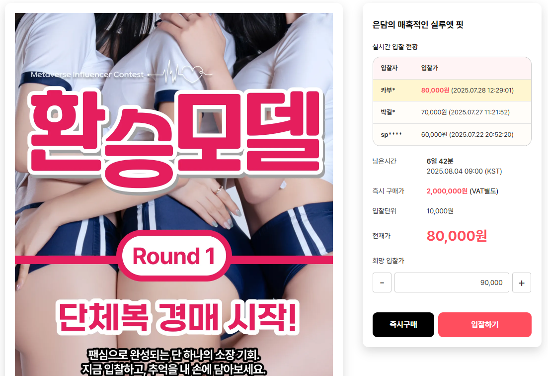 인플루언서가 입은 의상을 경매 방식을 통해서 구매할 수 있는데… 즉시 구매가 200만 원으로 구매할 수 있기는 해도 대체로 즉시 구매가에 팔리기보다는 팬들이 눈치를 보면서 싸움을 하는 듯하다. 특히, 팬들은 내가 좋아하는 인플루언서가 2위로 진출하도록 표를 투자해야 하다 보니 과감히 굿즈 구매에 투자하기는 어려울 것 같았다.