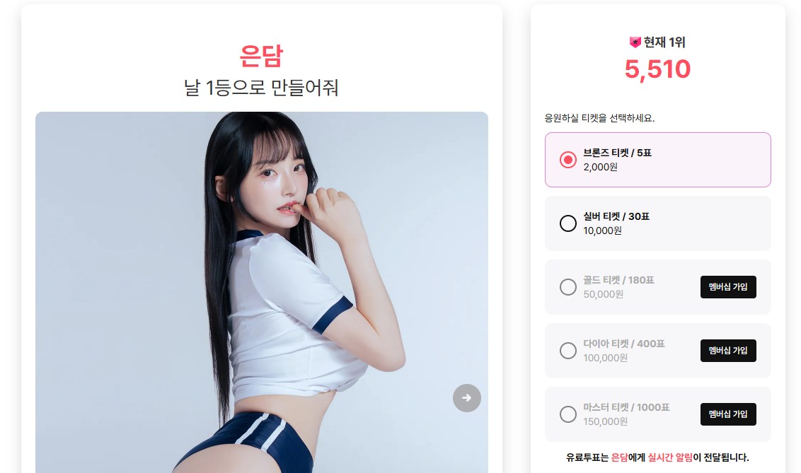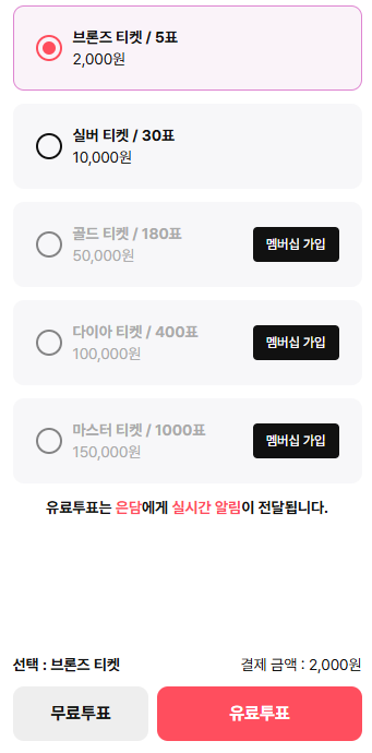 <환승모델>에서 내가 응원하고 싶은 인플루언서에게 투표하기 위해서는 결제가 필요하다. 첨부한 사진에서 볼 수 있듯이 브론즈 티켓부터 마스터 티켓까지 내가 결제한 금액에 따라 행사할 수 있는 표의 수량이 달라진다. 기본적으로 하루에 한 번 무료 투표를 할 수 있다고 해도 큰손을 가진 팬들을 지닌 인플루언서가 유리한 게임이었다.