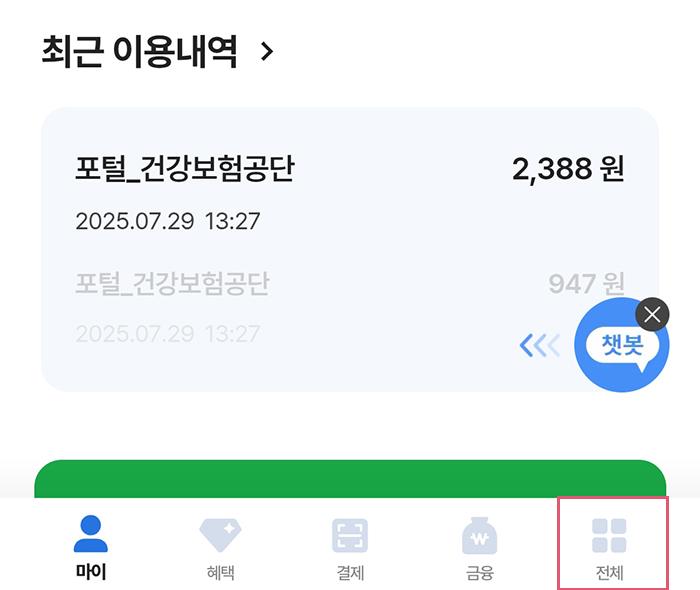 1. 평소 농협 카드를 사용하는 유저라면 'NH Pay' 어플에 접속해서 첨부한 사진에서 빨간색으로 표시해 둔 '전체'를 먼저 클릭하자. 전체 버튼은 항상 우측 하단에 있으니 쉽게 찾을 수 있을 것이다. 그러면 아래에 첨부한 사진에서 볼 수 있듯이 검색창을 비롯해 공공사업과 카드이용 등 여러 항목이 뜨는 것을 확인할 수 있다.