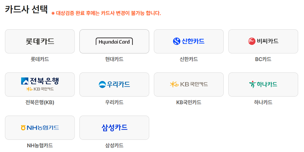 기본적으로 이번 소상공인 부담경감 크레딧 신청이 가능한 카드사는 신용카드면 다 된다고 생각하면 된다. 체크카드 형태가 많은 카카오페이 카드와 토스 카드 등은 이용할 수가 없었는데, 소상공인 부담경감 크레딧을 신청할 때 선택한 카드사는 추후 변경이 불가능하기 때문에 꼭 사용에 문제가 없는 카드사를 선택할 수 있도록 하자.