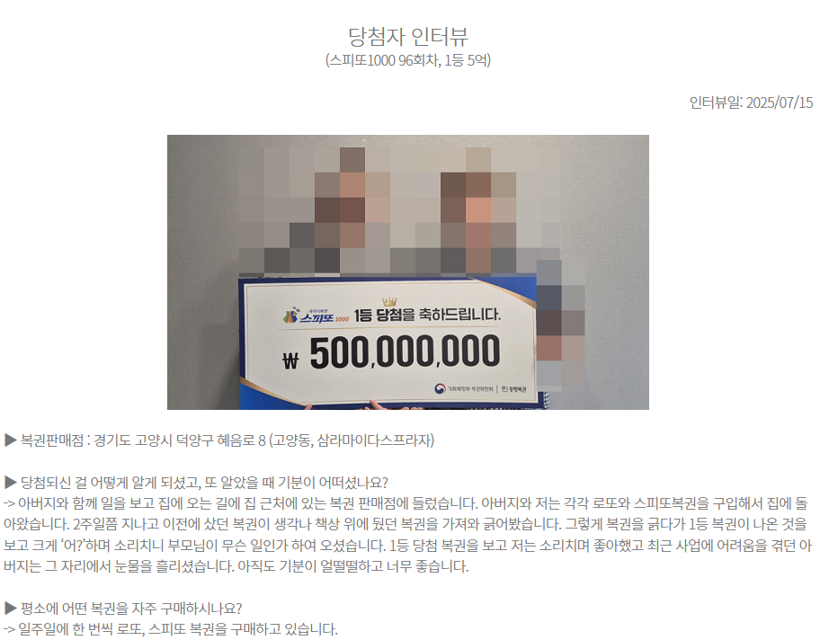 일주일에 한 번씩 로또, 스피또 복권을 구매한다고 하는 당첨자는 아버지와 함께 일을 보고 집으로 돌아오는 길에 구매한 복권이 1등에 당첨이 되었다고 밝혔다. 특히, 그는 당첨자 소감 한마디에 '아무리 힘들더라도 그냥 살자.'라고 적어 놓았는데, 역시 긍정적인 마인드로 오늘을 살아가는 것이 무엇보다 중요해 보인다.
