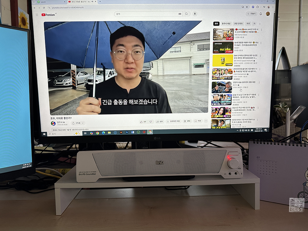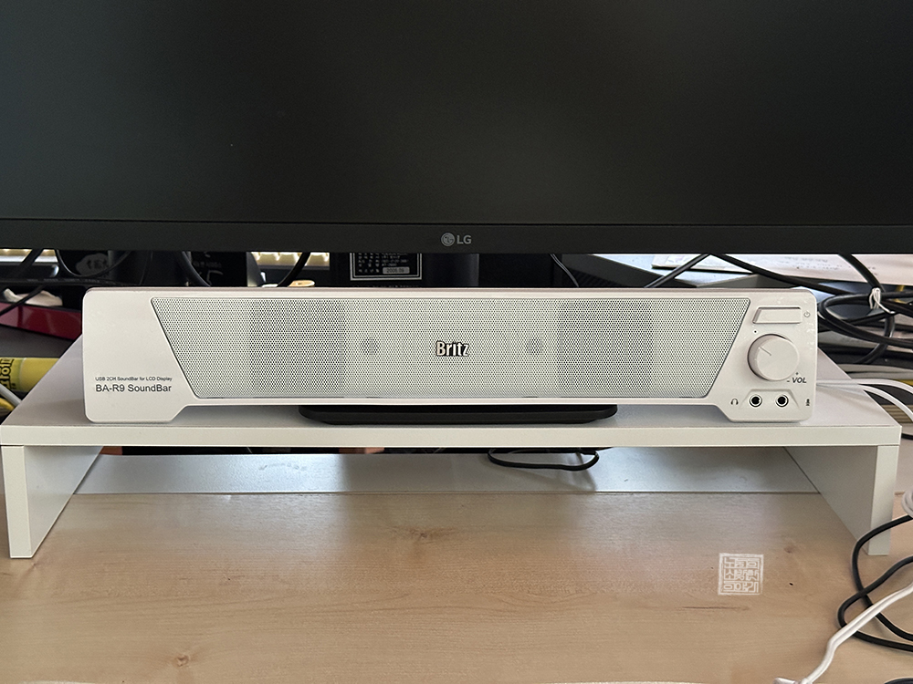 이렇게 화이트 모니터 받침대 위에 컴퓨터 사운드바 브리츠 BA-R9 화이트를 놓았을 때 아주 깔끔해서 보기 좋았다. 물론, 모니터가 검정색이라는 게 살짝 아쉬운 부분이기는 해도 이건 어쩔 수 없다고 생각한다. 그리고 사운드바 특징상 모니터 스탠드를 가로 지르는 형태로 놓아도 아주 문제 없이 깔끔히 배치할 수 있었다.