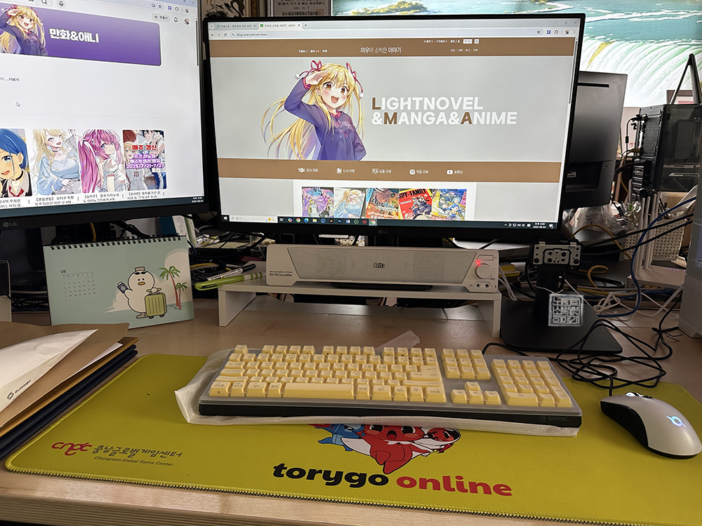 첨부한 사진에서 볼 수 있는 모습은 사무실 컴퓨터 책상의 모습으로, 과거에는 스피커를 양쪽으로 놓는 제품을 쓰다 보니 공간 차지를 많이 했었지만 지금은 사운드바 스피커를 모니터 받침대 위에 올리면서 책상을 나름 깔끔하게 정리할 수 있었다. 물론, 오른쪽의 엉킨 선들이 신경 쓰이기는 해도 최대한 깔끔하게 정리한 모습이다.