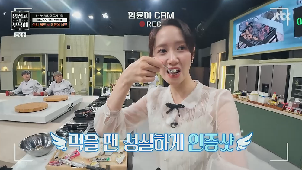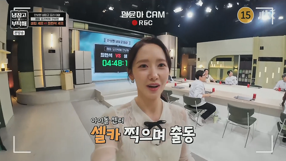 그리고 샘킴 셰프와 최현석 셰프가 요리 대결을 펼칠 때 안정환을 대신해 윤아가 5분 점검 MC로 나서게 되었다. 똑같은 액션캠으로 찍더라도 윤아가 카메라에 비치는 건 카메라가 완전히 다르게 느껴질 정도로 비율이 달랐다. 평소 <냉장고를 부탁해> 팬답게 그녀는 시식하면서도 재미있는 리액션을 보여주면서 모두의 환호를 이끌어냈다.