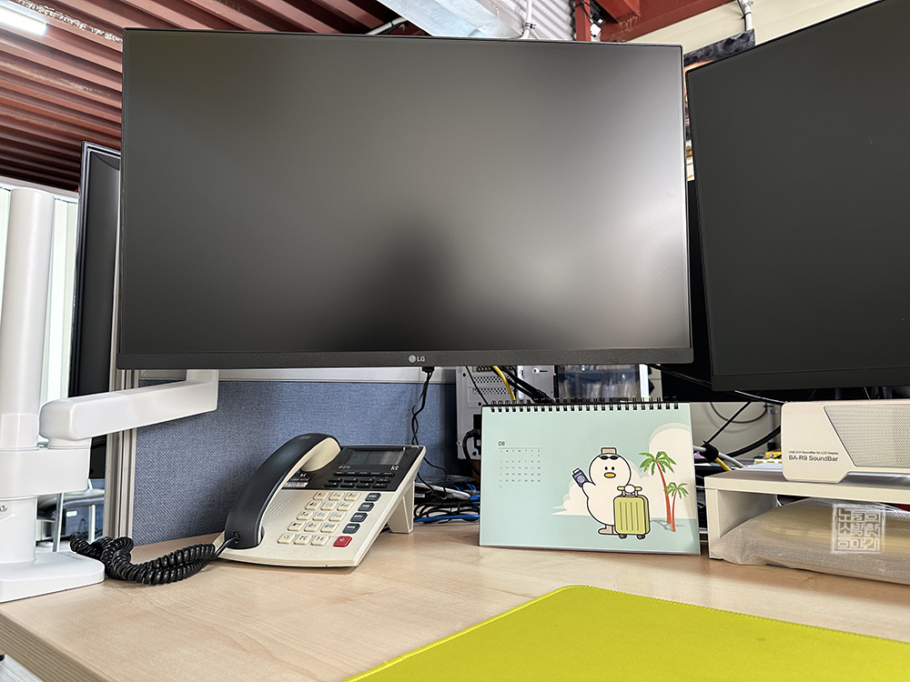 이렇게 모니터암을 이용해서 모니터를 설치했더니 모니터 받침대로 인해 막혔던 공간을 모두 활용할 수 있게 되면서 사무실 유선 전화기를 편하게 사용할 수 있게 되었다. 그리고 모니터의 높이는 모니터암의 특징 때문에 또 두 대의 모니터에 차이가 생길 수밖에 없었지만, 너무 낮게 보는 것보다 오히려 이 각도가 더 괜찮았다고 생각한다.