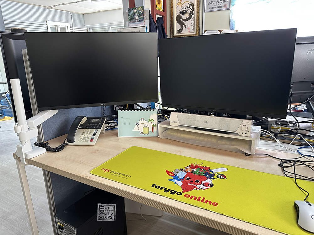 이렇게 모니터암을 이용해서 모니터를 설치했더니 모니터 받침대로 인해 막혔던 공간을 모두 활용할 수 있게 되면서 사무실 유선 전화기를 편하게 사용할 수 있게 되었다. 그리고 모니터의 높이는 모니터암의 특징 때문에 또 두 대의 모니터에 차이가 생길 수밖에 없었지만, 너무 낮게 보는 것보다 오히려 이 각도가 더 괜찮았다고 생각한다.