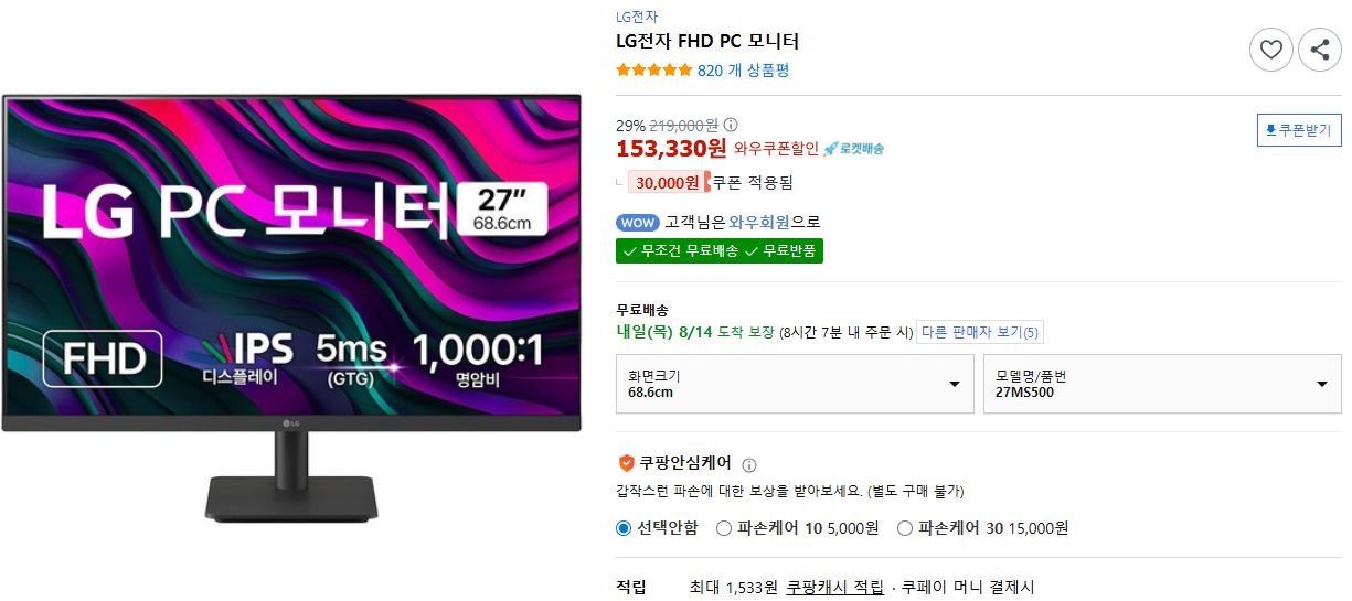 쿠팡에서 현재 15만 원에 구매가 가능한 LG 27인치 모니터