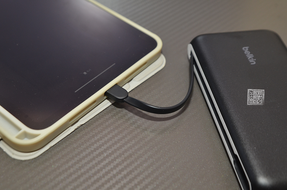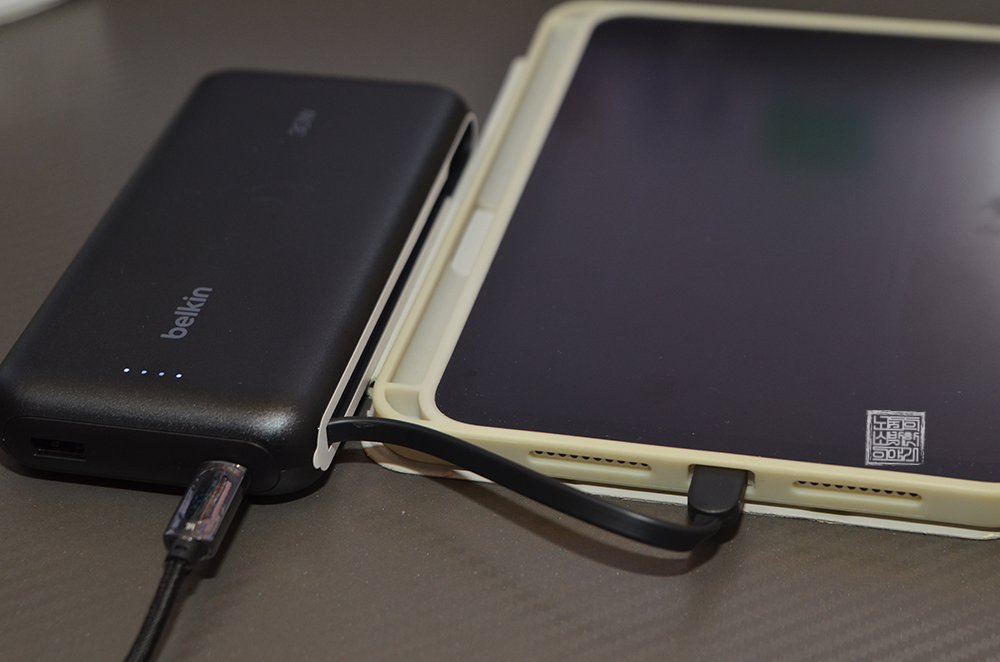 벨킨 부스트차지 케이블 일체형 보조배터리 C타입에 장착된 케이블은 C타입 포트이다 보니 기본적으로 C타입 포트를 가지고 있는 기기를 충전하는 데에 적합하다. 내가 오랜 시간 동안 전자책을 읽는 용도로 꾸준히 사용하고 있는 아이패드 미니 6세대에 연결했을 때 인식 오류가 발생하는 일 없이 곧바로 빠르게 충전이 되는 것을 확인할 수가 있다.