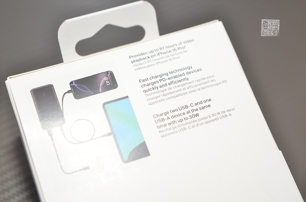 첨부한 사진에서 볼 수 있는 배터리가 들어가 있는 종이 상자의 뒷면을 보면 '아이폰 16프로를 기준으로 87시간 동안 비디오를 시청할 수 있는' 전력을 자랑한다고 말한다. 더욱이 고속 충전 배터리인 만큼 하나의 제품만 충전할 수 있는 게 아니라 배터리 내부에 장착된 케이블과 따로 케이블을 연결해서 최대 3기기 동시 충전도 가능했다.
