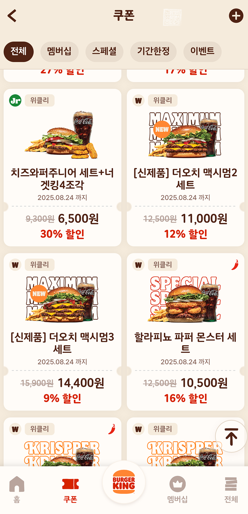 기본적으로 버거킹 멤버십에 가입되어 있는 회원이라고 한다면 등급에 상관없이 매달 위 사진에서 볼 수 있는 형태의 쿠폰을 받아볼 수 있다. 등급이 높아지면 더 다양한 상품을 더 큰 할인폭으로 구매할 수 있다고 하는데, 나는 등급이 낮다 보니 언제나 기본 쿠폰만 받아볼 수 있다. 그래도 가끔씩 쓰기에는 나쁘지 않았다.