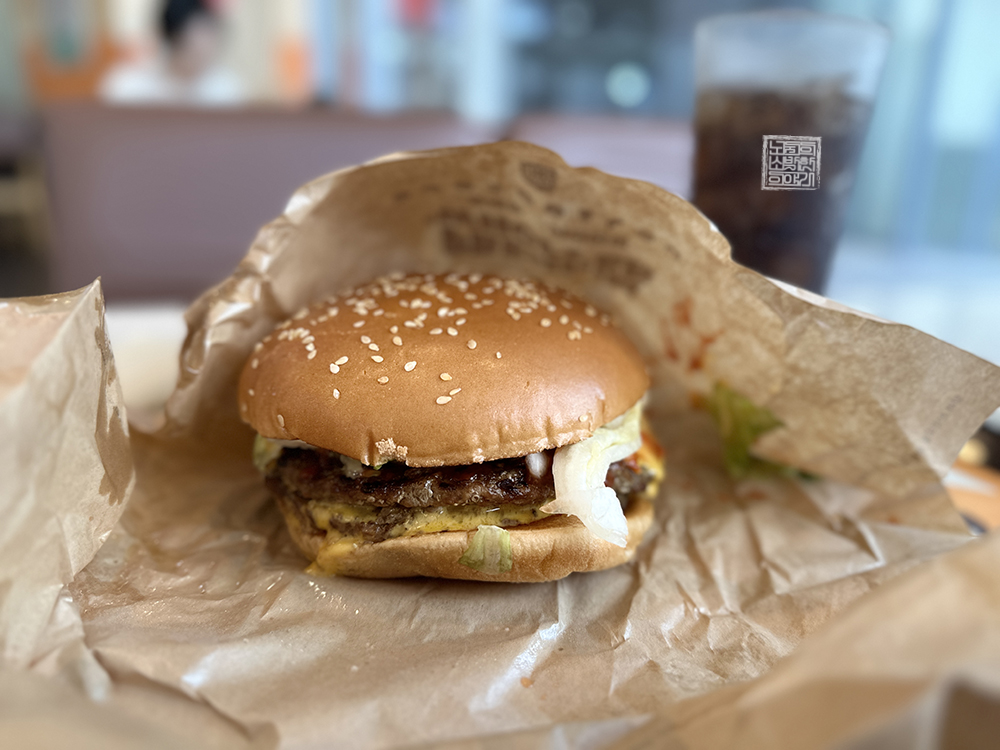 나는 주문할 때 콜라를 제로 콜라 라지 사이즈로 바꾸고, 감자튀김을 치즈 스틱으로 바꾸고 주문했는데… 더블 오리지널 치즈 맥시멈 실물은 사진에서 볼 수 있는 것만큼 그렇게 압도적인 크기를 자랑하지 않았다. 원래 보통 햄버거는 광고로 보는 이미지보다 실물이 보여주는 존재감이 적은 편이다 보니 어쩔 수 없는 일이다.