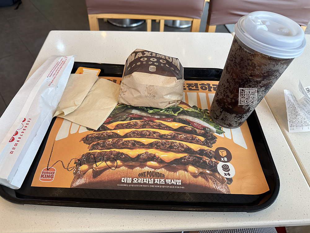 시청에서 일을 마치고 돌아오는 길에 점심시간이 되어 무엇을 먹을지 한참 고민하다가 사무실까지 걸어가는 길에 있는 버거킹 아이스퀘어점에서 점심을 해결하기로 했다. 이곳 버거킹을 찾지 않은지 꽤 오랜 시간이 지나기도 했고, 버거킹과 추성훈이 함께 광고를 촬영한 신메뉴 더블 오리지널 치즈 맥시멈을 먹어보고 싶기도 했다.