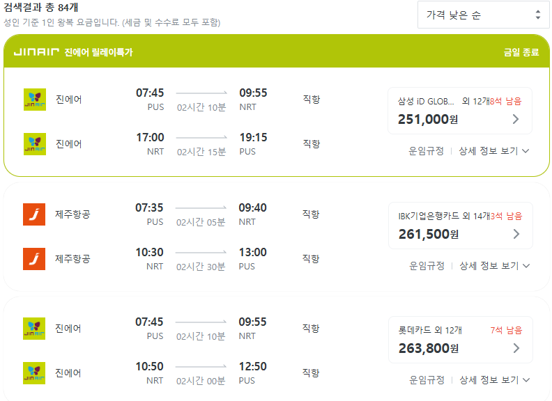 아래 사진에서 볼 수 있는 도쿄 왕복 항공권 진에어 릴레이 특가 최저가는 나리타 공항을 기준으로 하고 있는데, 특정 카드를 이용할 경우에는 개별적인 혜택을 받을 수 있으니 자세한 건 직접 홈페이지에 접속해 확인을 해보자.
