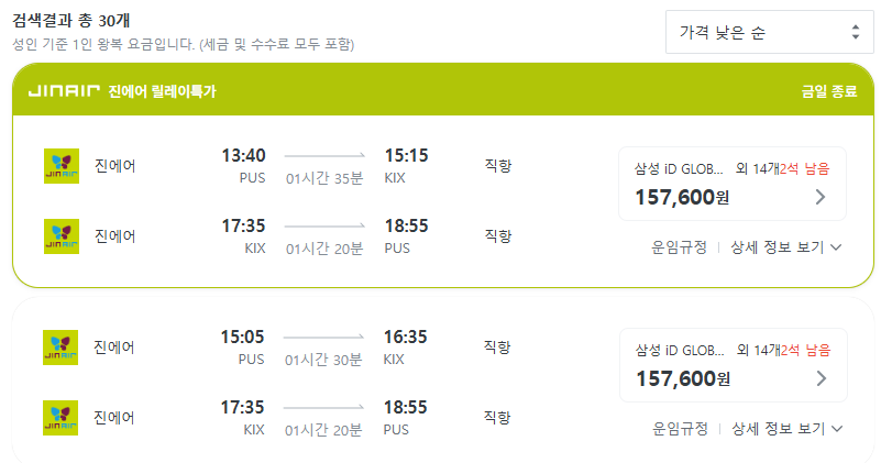 개인적으로 나는 일본 여행만 아니라 서울에 행사가 있어 서울을 찾을 때도 항상 진에어를 고집하고 있다. 그 이유는 비행기 가격이 다른 브랜드에 비해 비교적 저렴하기 때문인데… 현재 이벤트가 진행되고 있는 오사카 항공권 특가를 본다면 부산김해 출발 최저가가 15만 원부터 25만 원까지 형성되어 있어 날짜를 자유롭게 선택할 수 있었다.