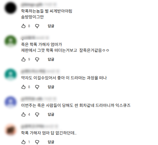 종종 학교 폭력을 저질렀어도 부모님의 도움으로 평범하게 살면서 사회적으로 인지도가 있는 직업을 얻어 잘 사는 가해자들이 있다. 그런데 그 가해자들이 뒤늦게 학교 폭력 가해자였다는 사실이 피해자들로부터 폭로되어 사회적으로 지탄을 받게 되면 그들은 반성하는 척을 할 뿐…, 진심으로 반성하는 경우도 굉장히 극소수일 것이다.