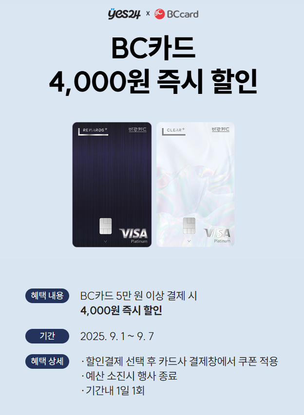 그리고 한 가지 팁을 더 제공하자면… 현재 인터넷 서점 예스24에서는 오는 9월 7일(일)까지 5만 원 이상 BC카드로 결제할 경우 4천 원 즉시 할인 서비스를 제공하고 있다. 첨부된 사진에서 볼 수 있는 카드는 BC바로카드만 되는 것 같지만, 직접 확인을 해보니 바로카드가 아니라고 해도 BC카드라면 어떤 카드라도 적용이 되는 듯했다.