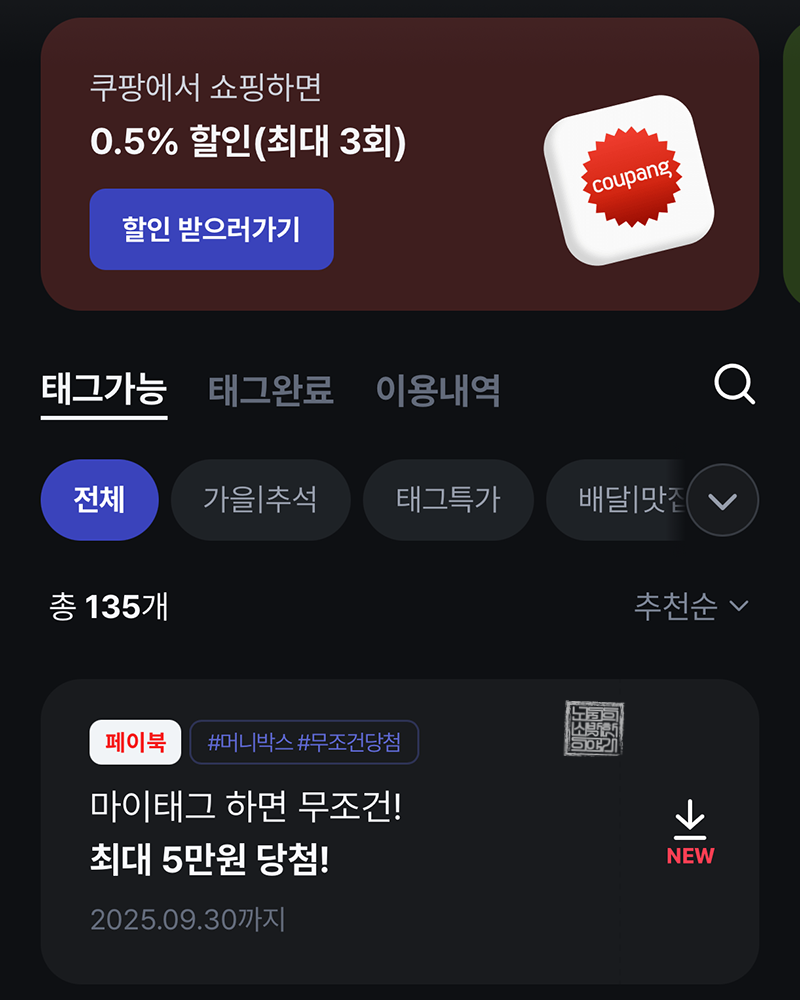 가장 먼저 확인할 수 있는 혜택은 페이북 어플을 통해서 혜택-마이태그로 접속할 경우 받을 수 있는 최대 5만 원까지 당첨이 되는 머니박스다. 아쉽게도 이 머니박스를 통해 100원이 넘는 경우가 지금까지 딱 1번 있었을 정도로 확률은 미비하다 보니 솔직히 기대하지 않고 열어보는 게 좋다. 대신, 우리는 다른 혜택에 더 집중해야 한다.