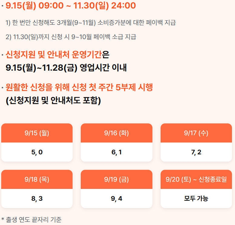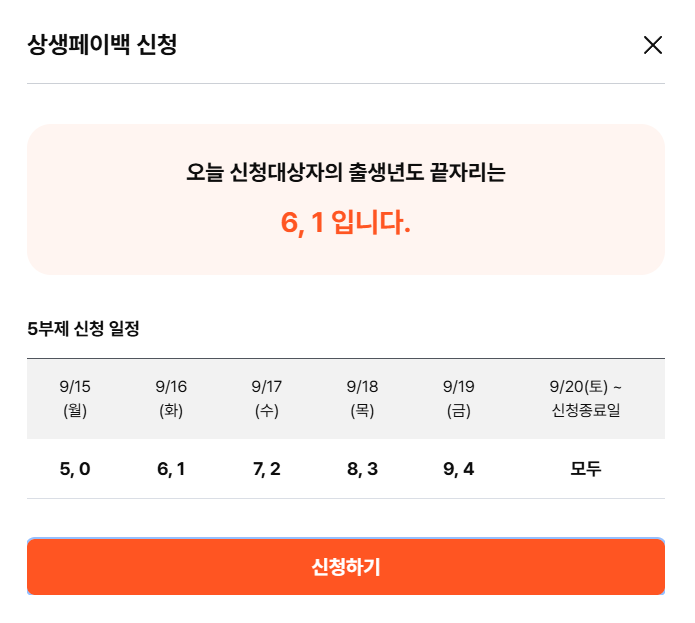 상생 페이백을 신청하는 방법은 쉽다. 다른 가짜 홈페이지에 접속하는 것을 주의하면서 ' 상생페이백.kr ' 주소로 지정된 홈페이지를 방문한 이후 나의 출생년도 끝자리에 맞춰서 월~금까지 신청을 할 수 있다. 만약 출생년도 끝자리에 신청이 가능한 날에 신청하는 것을 깜빡했다면 9월 20일(토)부터 신청 종료일까지 누구나 신청할 수 있다.