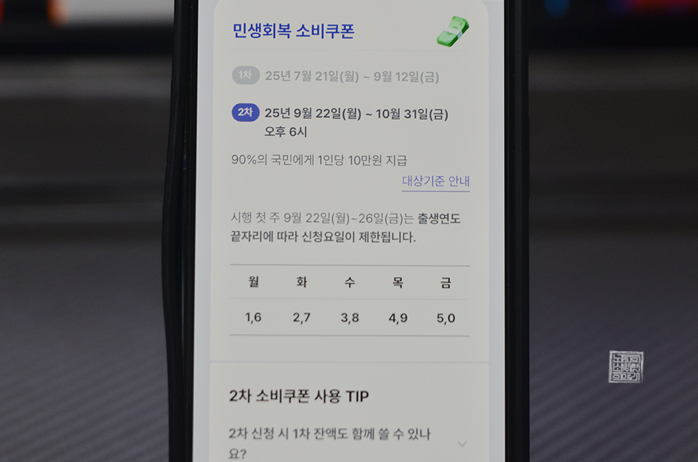 지난 9월 22일(월)부터 2차 민생회복 소비쿠폰 신청 접수가 시작되었다. 1차 때와 마찬가지로 첫 주에는 출생연도에 따라서 월~금까지 나누어서 카드사와 온라인을 통해 신청할 수 있다. 소득 하위 90% 사람들, 다시 말해서 소득 상위 10%를 제외한 국민들에게 지급되는 이번 2차 민생회복 소비쿠폰의 금액은 10만 원으로 정해져 있다.