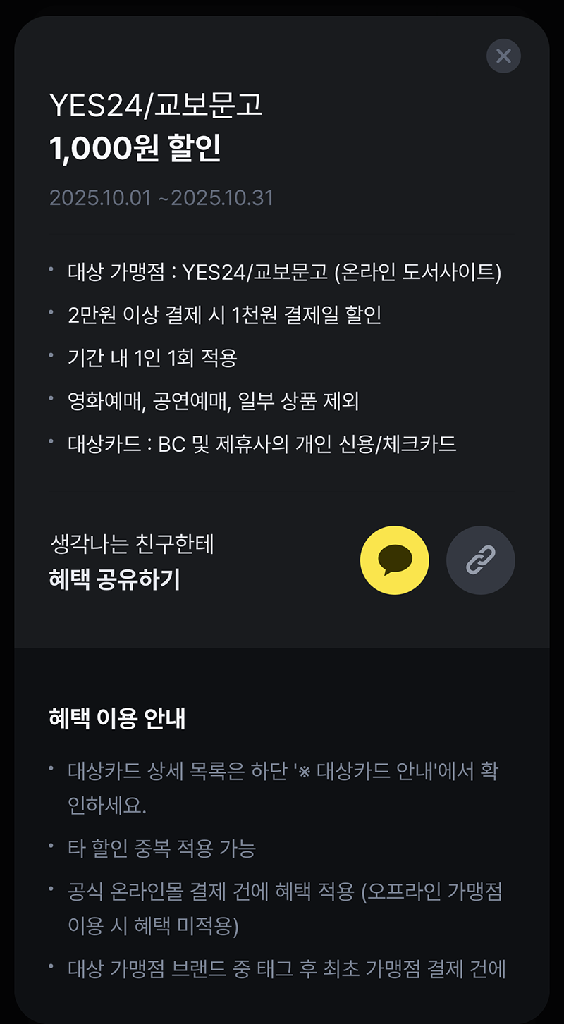 개인적으로 페이북 마이태그 할인 혜택 중에서 매달 쏠쏠하게 챙기는 할인 혜택은 서점 예스24와 교보문고에서 2만 원 이상 결제할 경우 1천 원 결제일 할인을 받을 수 있는 혜택이다. 아무리 먹고 살기 힘들어도 책을 매달 꾸준히 구매해서 읽고 있다 보니 1천 원 할인은 한 번도 놓친 적이 없었다. 평소 책을 좋아한다면 이 혜택을 꼭 챙기도록 하자.