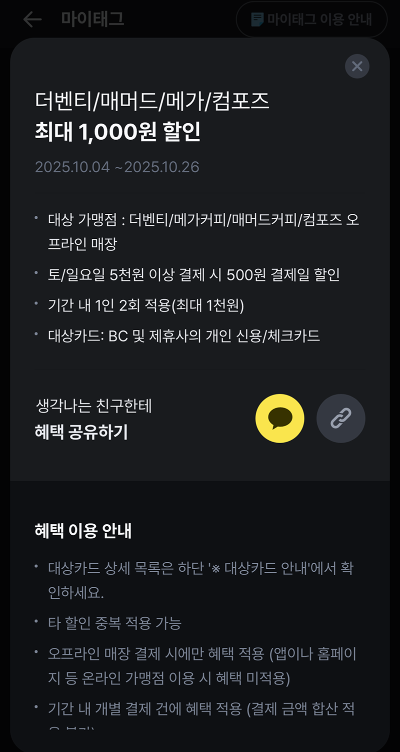 그리고 평범하게 살아가는 우리가 하루를 버티기 위한 카페인 혹은 휴식을 취하기 위한 당을 충전하기 위해서 이용하는 카페에서도 할인을 받을 수 있는 마이태그도 있었다. 더벤티와 매머드, 메가커피, 컴포즈 총 4곳의 가맹점에서 토요일과 일요일 5천 원 이상 결제할 경우 500일 결제일 할인을 최대 1인 2회까지 받을 수가 있다.