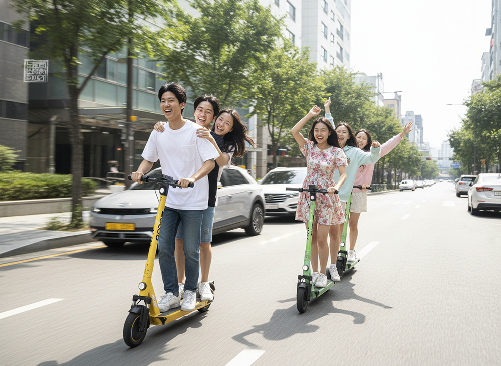 킥보드는 인도를 불편하게 차지하고 있는 경우도 많은 데다가 성인만 아니라 청소년들도 거의 자유롭게 탈 수 있다 보니 문제다. 특히, 자기가 쓸 수 있는 돈이 그렇게 많지 않은 청소년들은 한 대로 여러 명이 타는 경우가 많다. 첨부한 사진에서 볼 수 있는 이미지는 AI 생성 이미지이지만 내가 일요일에 실제로 본 모습이다.