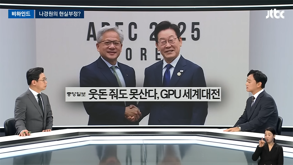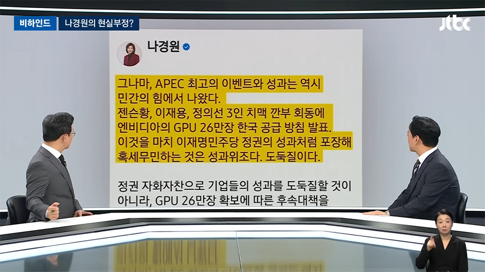 이재명 대통령이 당선된 이후 정부를 운영하면서 매일 같이 나라가 망한다며 나라가 망하기를 바라는 발언만 내뱉는 내란당 국민의힘 의원들은 이번 APEC 2025 성과도 부정하기 바빴다. 특히, 이재명 대통령이 젠슨황과 맺은 GPU 26만 장 우선 제공 협약에 대해서 나경원은 APEC의 성과는 민간의 힘이라면서 정부가 도둑질을 했다고 비판했다.