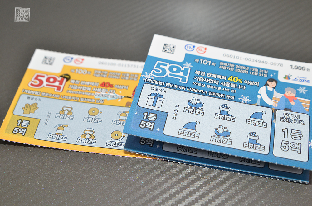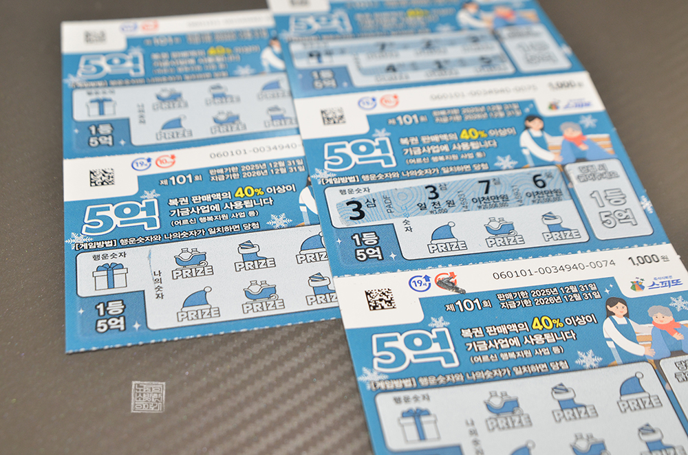 지난 토요일이 되기 전에 가까운 복권 판매점을 찾았을 때 첨부한 사진에서 볼 수 있는 스피또1000 즉석 복권을 구매했다. 원래는 아직 잔여수량이 많이 남아 있는 스피또1000 100회 한 장을 당첨된 복권 하나로 맞교환할 생각이었는데, 새롭게 101회가 판매되는 것을 보고 잔돈 5천 원을 가지고 한번 구매를 해 보았다.