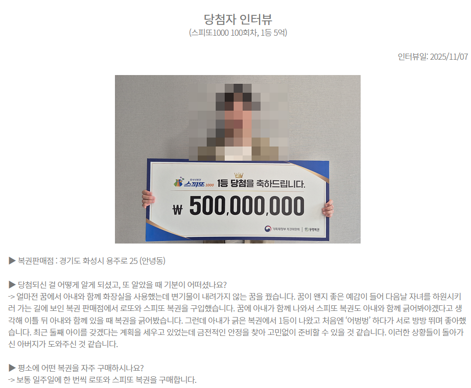 스피또1000 100회 차 1등 당첨자 인터뷰