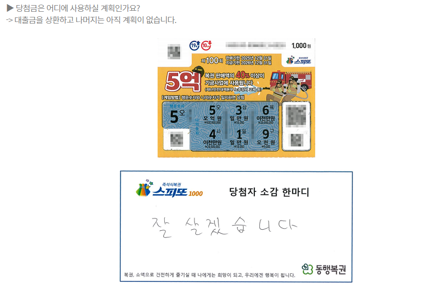 이번에 동행복권 홈페이지를 통해 읽어볼 수 있는 가장 최근에 스피또1000 100회 당첨자 인터뷰는 위와 같다. 당첨자는 보통 일주일에 한 번씩 로또와 스피또 복권을 구매한다고 하는데… 당첨금으로 대출금을 상환하고 나머지는 아직 계획이 없다고 한다. 평범히 살아가는 서민들에게 5억은 대출금을 갚을 수 있는 아주 큰돈이다.