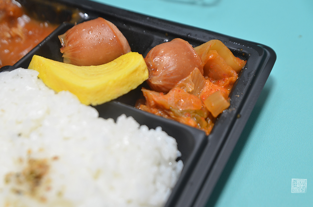 보통 이런 돈까스만 아니라 편의점 도시락에 들어가는 반찬은 볶음 김치가 대부분이다. 타 편의점의 도시락을 본다면 강정과 함께 오뎅볶음이 들어가 있기도 하지만, 이렇게 계란말이와 함께 소시지와 볶음 김치가 들어간 구성도 마음에 들었다. 아무리 돈까스를 좋아하는 사람이라고 해도 김치가 빠지면 조금 섭섭하다고 할까?