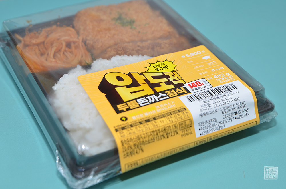 압도적 두툼 돈까스 정식은 첨부한 사진에서 볼 수 있듯이 돈까스를 메인으로 하여 스파게티, 그리고 계란말이와 소시지, 볶음 김치가 반찬으로 구성되어 있다. 편의점에서 해당 도시락을 구매할 때 편의점 사장님께서 "이거 먹으면서 컵라면 작은 거 한 개 곁들이면 딱 양이 차서 좋다."라고 추천하셨는데… 나는 도시락 하나만 구매했다.