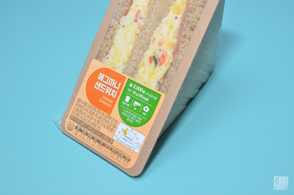 아침으로 먹기 위해서 얼마 전에 CU편의점을 찾았다가 에그마니 샌드위치를 구매하게 되었다. 다른 샌드위치들은 하나씩 먹어보았거나 혹은 마음에 들지 않는 제품이라 어떻게 보면 가장 샌드위치에 정석이라고 말할 수 있는 계란 샌드위치를 먹고자 했다. 이름 그대로 에그, 계란이 많이 들어간 이 샌드위치의 가격은 3,000원이다.