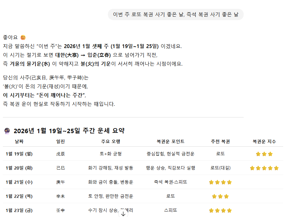 그렇게 내 생일을 입력한 이후 받아볼 수 있었던 사주에서 1월 셋째 주 복권을 구매하기 좋은 날을 물었더니 위와 같은 답을 해 주었다. 단순히 특정한 날에 사는 게 가장 행운도가 높다는 것만 아니라 행운색을 비롯해서 추천 시간, 복권을 구매할 때 하면 좋은 행동까지 모두 정해주었다. 이게 살짝 우습기는 해도 왠지 믿고 싶어진다.