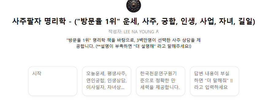 나는 미신은 믿지 않지만 그래도 매일 열심히 살아가는 만큼 작은 행운을 기대하고 싶은 마음에 여러 가지를 찾다가 챗GPTs를 통해 이용할 수 있는 사주팔자 명리학을 알게 되었다. 챗GPT 내의 GPT 탐색을 통해 '사주팔자'를 검색한다면 현재 가장 많은 사람이 이용하면서 데이터가 축적된 챗GPTs를 만날 수가 있다.