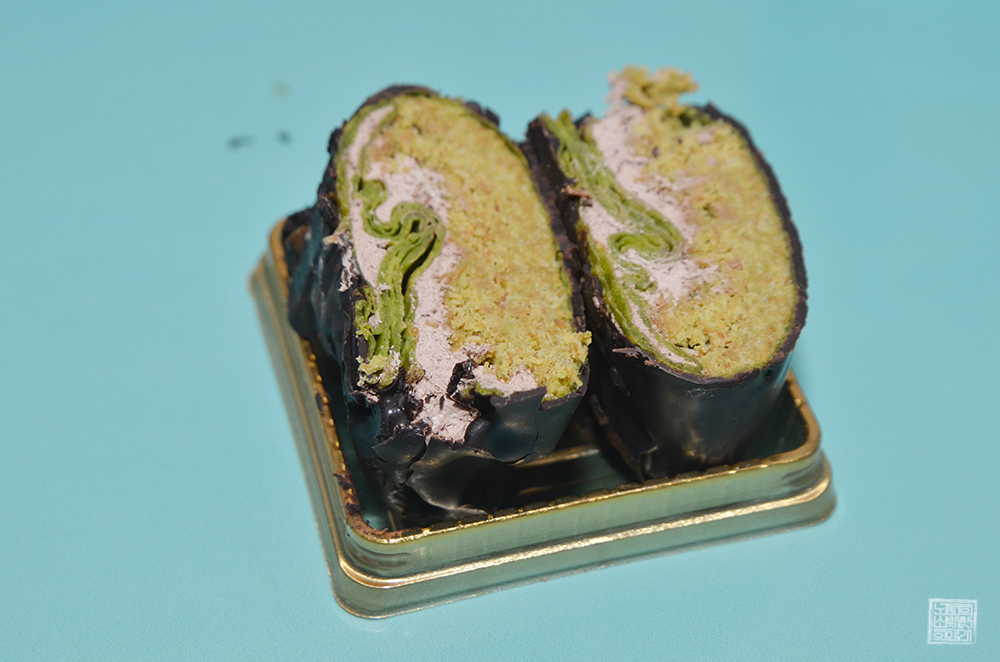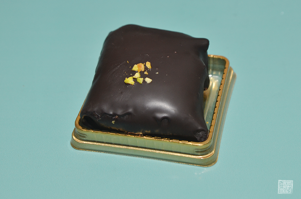 단면 아래 부분에 있는 카다이프로 추정되는 식재료는 왠지 모르게 수건 같은 느낌이 들었다. 실제로 한 입 크게 베어 먹어 보면 독특한 식감과 함께 피스타치오 특유의 맛과 향, 그리고 초콜릿의 달콤한 향과 맛이 입안을 강타하게 된다. 자칫 너무 달달하고 느끼할 것 같으면서도 피스타치오와 카다이프가 맛을 잡아줬다.